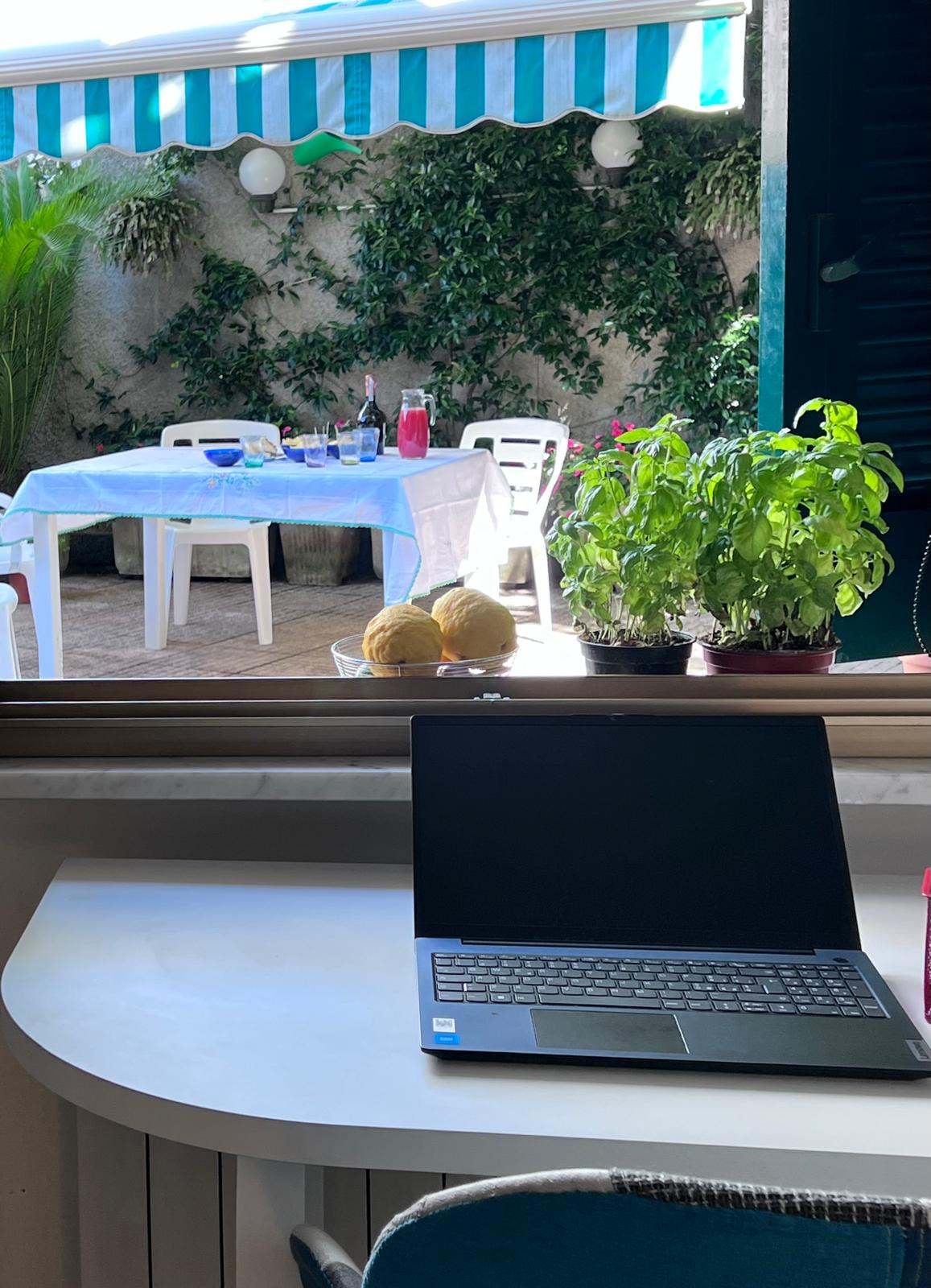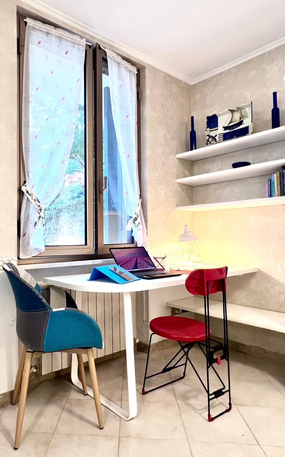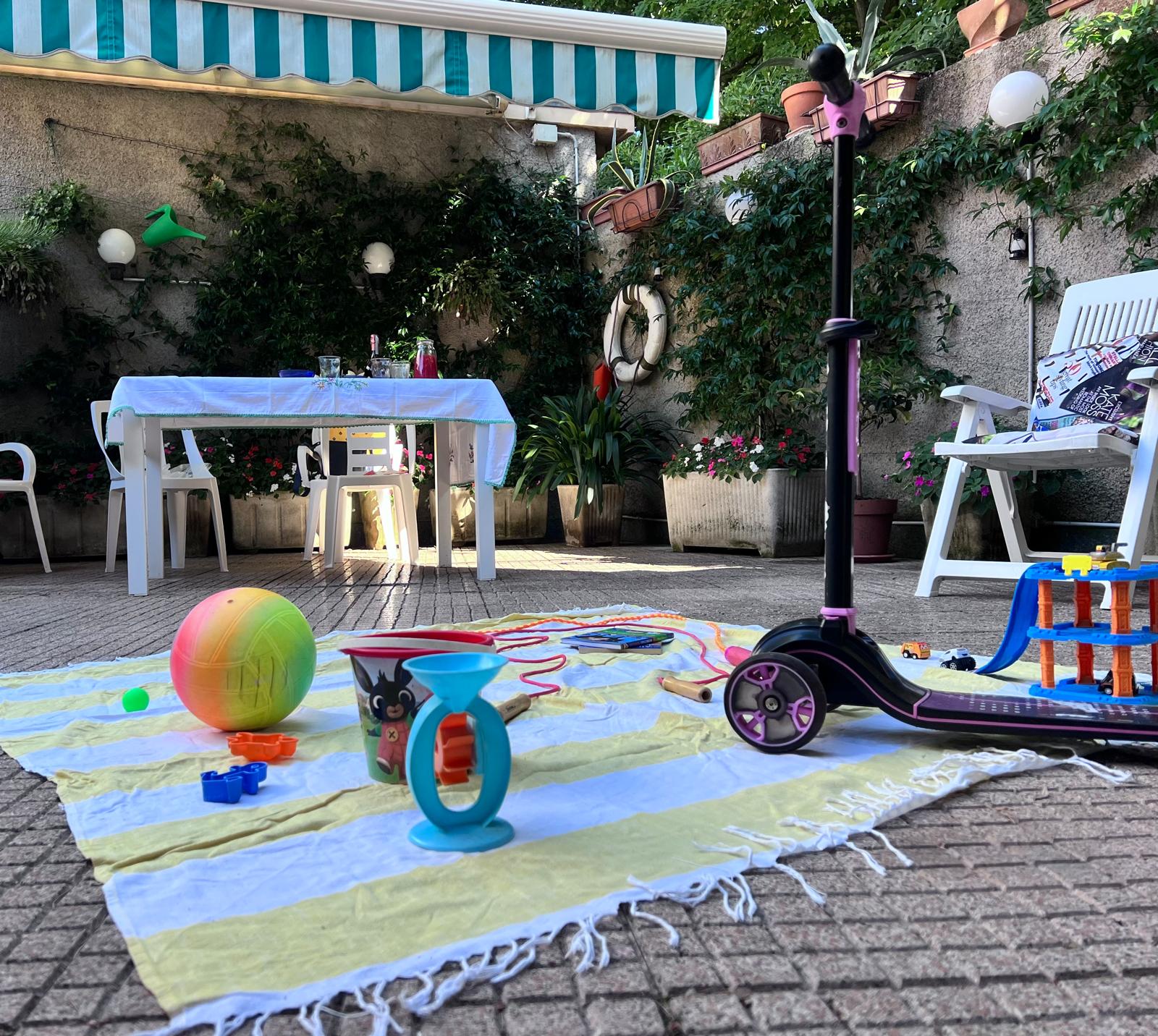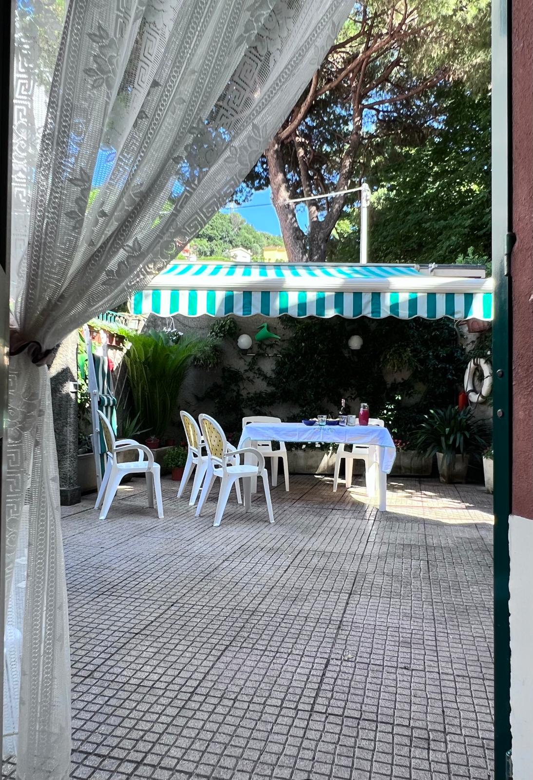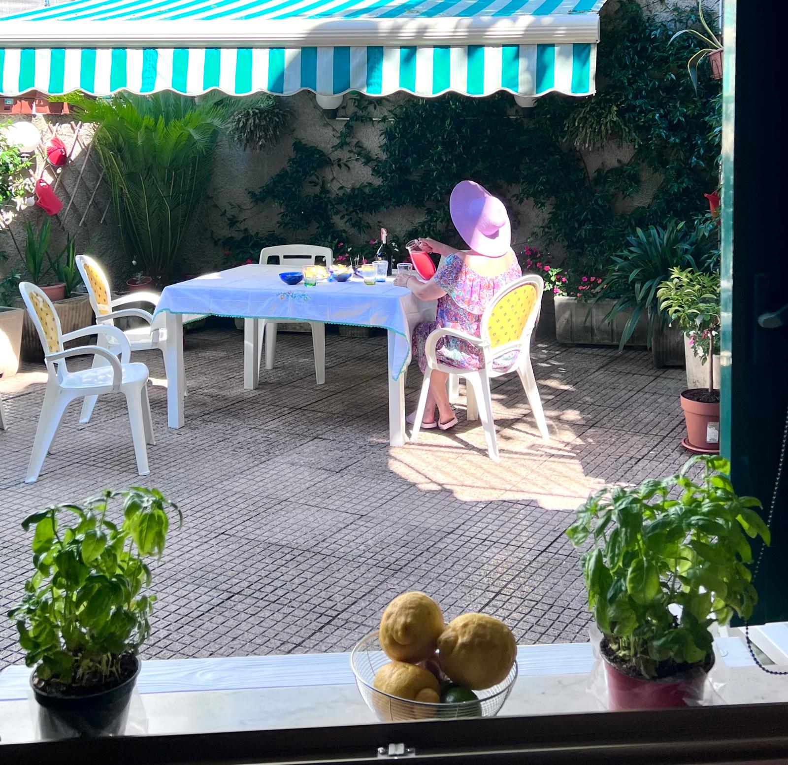 L’appartamento è al piano terra di una palazzina storica. Vi si accede tramite un cancello privato che si apre su un patio di 50mq ad uso esclusivo e abbellito da piante fiorite, con tavolo per pranzare all’aperto e ampio tendone ad apertura elettrica.